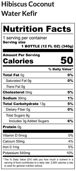 - Hibiscus: Filtered water, coconut water*, water kefir culture, hibiscus extract, cherry juice*, lemon juice*, organic cane sugar, live probiotics (Bacillus subtilis).
