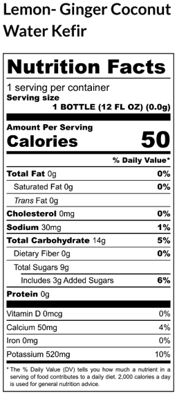 - Lemon-Ginger: Filtered water, coconut water*, water kefir culture, lemon juice*, ginger juice, organic cane sugar, live probiotics (Bacillus subtilis).